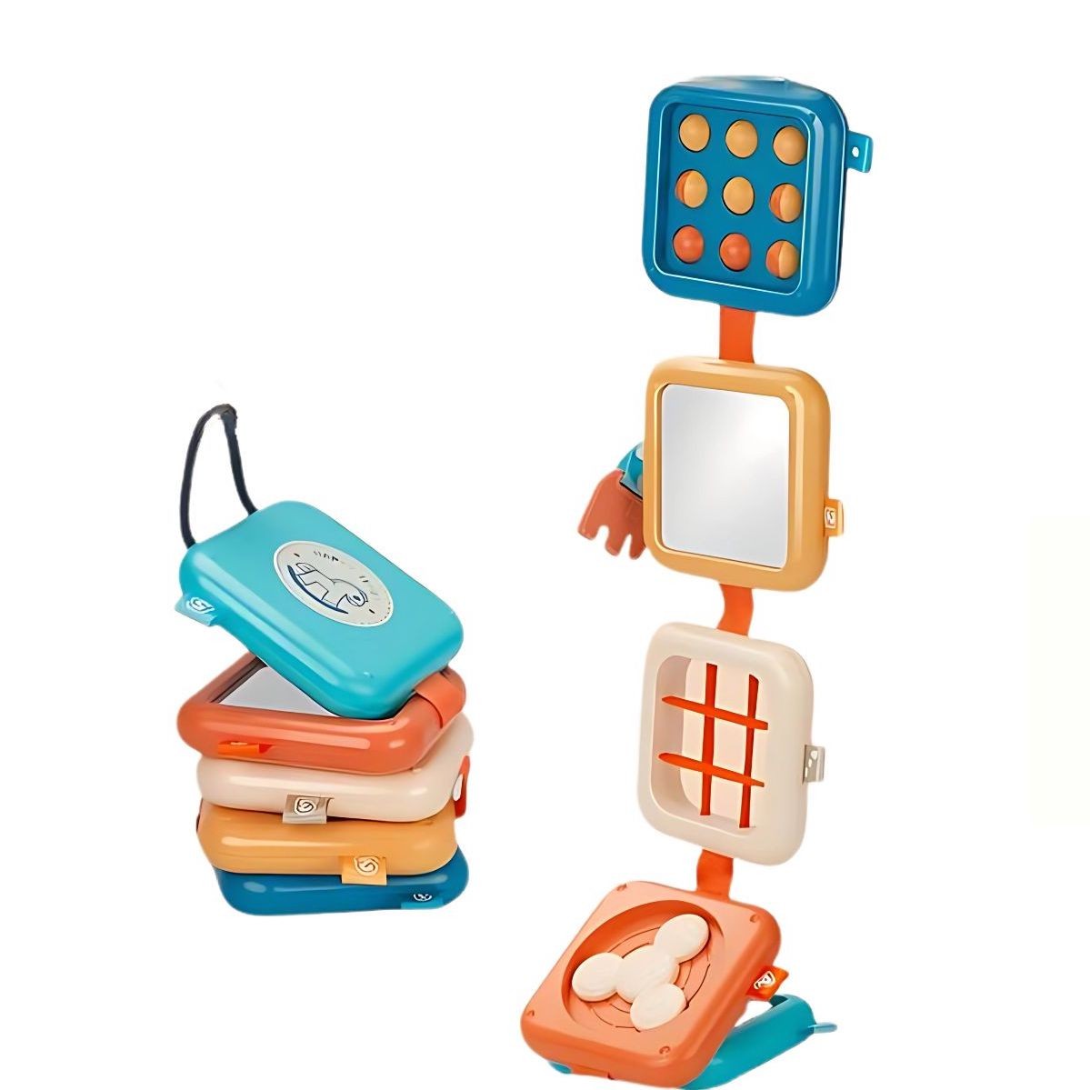 Dieses 8-in-1 sensorische Babyspielzeug bietet eine Fülle an Aktivitäten, die Babys zum Fühlen, Greifen und Erkunden anregen. Das Spielzeug besteht aus fünf bunten, flexiblen Plättchen, die sicher zusammengebunden sind und sich leicht entfalten und wieder zusammenfalten lassen. Die verschiedenen Texturen und Farben der Plättchen fördern die sensorische Wahrnehmung und unterstützen die motorische Entwicklung des Babys.